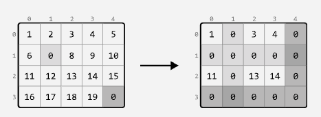 For each zero in an m x n matrix, set its entire row and column to zero in place.