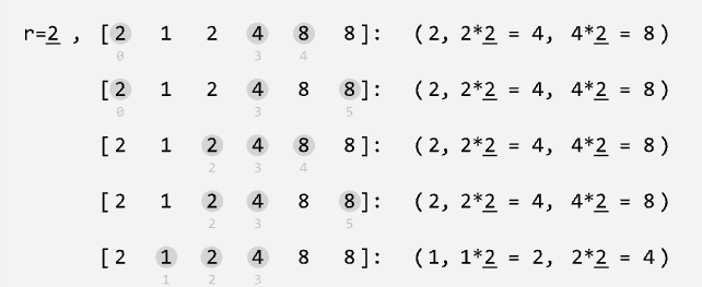 Input: nums = [2, 1, 2, 4, 8, 8], r = 2