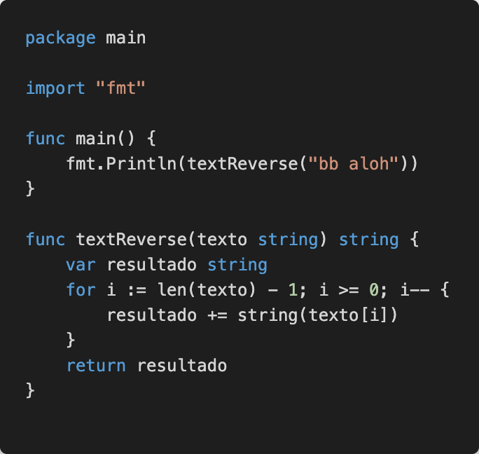 cuando recorres un string es como si tomara cada letra y la metiera en un slice por eso podemos acceder a ella, pero esta en formato byte y debemos convertirla de nuevo a texto “string(byte)”. En 4 ejemplos la funcción se llamara “textReverse”, si prefieres la puedes llamar “girarTexto” o el nombre que elijas.
