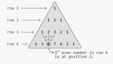 Given a value representing a row of this triangle, return the position of the first even number in this row. Assume that the first number in each row is at position 1.